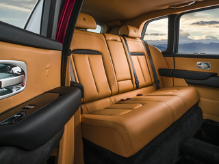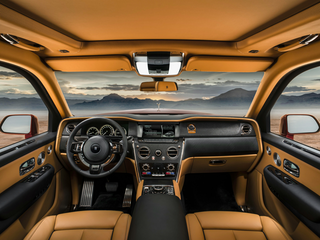 The Cullinan's unparalleled interior flaunts soft box-grain leather upholstery, plush lambs-wool carpets, and shiny wood and milled-aluminum details. The optional two-seat second row adjusts and massages to take comfort to new heights. The Viewing Suite option's leather-wrapped seats and a small table in the back are perfect for outdoor events. The Shooting Star Headliner turns the roof into a shimmering night sky. A spacious touchscreen and Apple CarPlay facilitate convenient, on-the-go connection. Rear entertainment screens and a powerful 18-speaker audio setup create a premium ambiance.